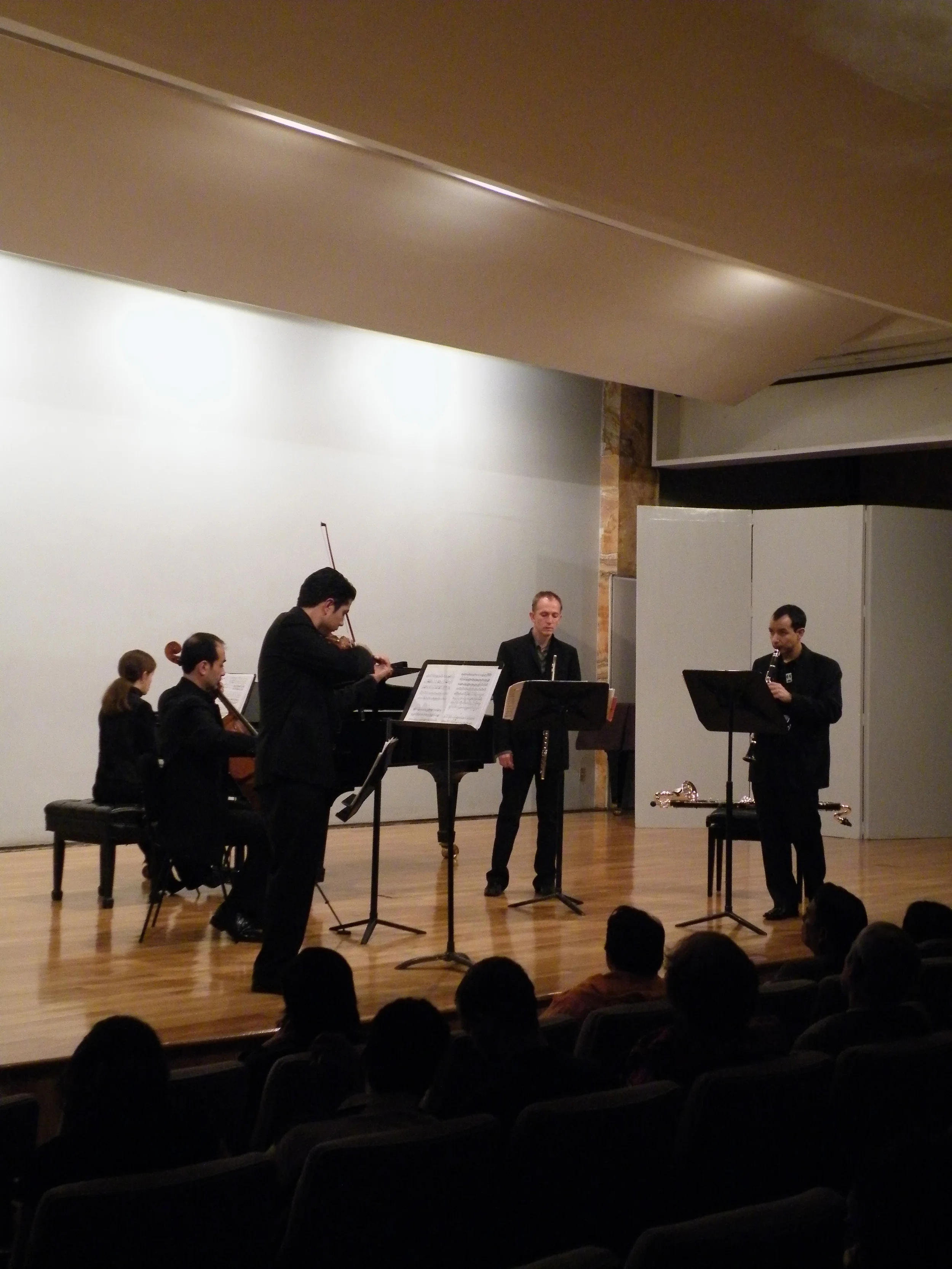 The order of instruments for the microphones is as following: Piano in the center. Facing the audience, on the right side, violin and violoncello; and from the left side flute and clarinet.